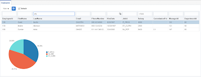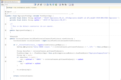 Table filter criteria is being intercepted by overridden method buildViewCriteriaClauses. Criteria clause is constructed here, we just need select FilterViewCriteria, the one originating from table filter. We could apply this criteria straight ahead to the VO responsible to bring chart data. However, this would not work - ADF BC would wrap original chart SQL query with SELECT * FROM (…) QRSLT WHERE (table filter criteria). This would not work, because table filter criteria is not present in the original chart SQL statement. To make it work, I’m updating original SQL query for chart data, by updating WHERE clause part: