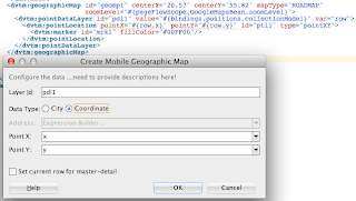 Drag and drop this Data Control on top of ADF Mobile Geographic Map component, JDeveloper generates point data layer automatically from the wizard: