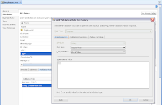 ADF BC offered out of the box business validation support is quite advanced - allows to control validation execution conditionally. Still some functionality is missing - easy configuration for execution order. Now we have entity and attribute level validations, but really this doesn't give any guarantee that entity level validation will not be invoked when attribute value is changed (especially true for ADF table component). In the future ADF versions I would like to have more control over validation execution order and time. This post is to demonstrate what is available now - conditional validation execution. Validation rule can be executed conditionally in ADF BC, for example depending on user security role (based on use case requirement, we may want to skip certain validation for the super user).