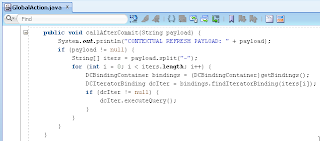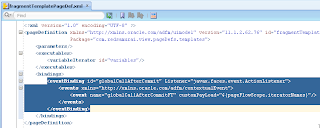 This post is extended version for my previous post - After Commit Call for Centralized Transaction Management. Previously posted application works as it should, but you may face a bit more complex use case when fragment template will be assigned with page definition file. If there will be page definition file for the fragment template - it will not work to call method by managed bean reference and invoke operation from fragment page definition. The thing is - page definition context will be changed from fragment to fragment template and operations declared in the fragment page definition will be unaccessible. However, we can implement communication between fragment template and fragment itself through ADF Contextual Events functionality.